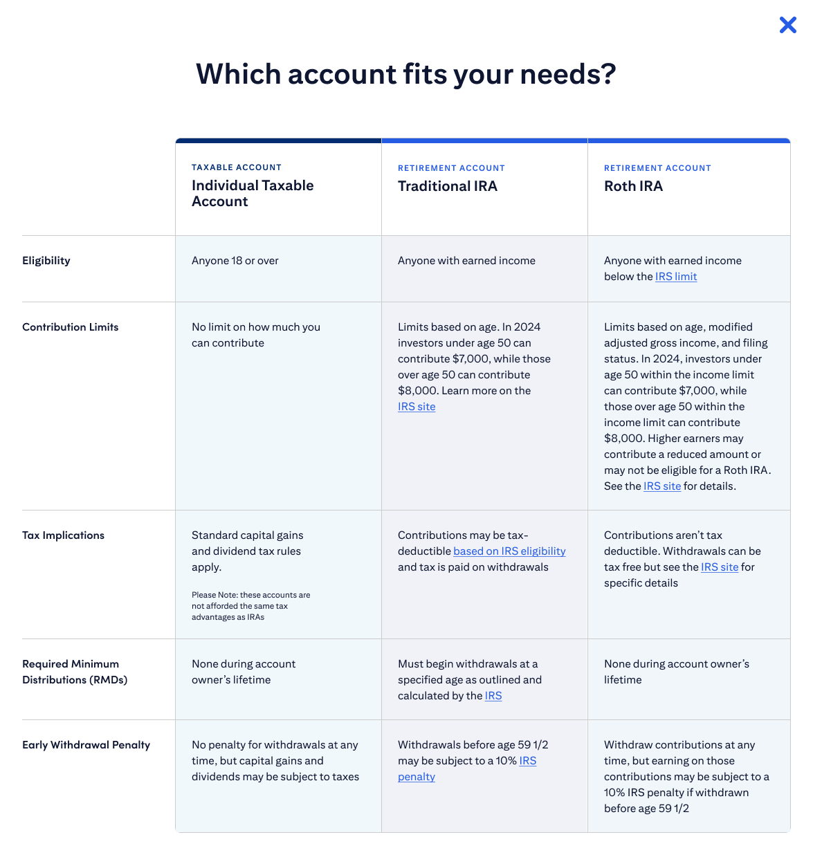 One opportunity we ended up capitalizing on was an in-depth comparison chart. Among our direct competitors, this is the most comprehensive explanation of retirement accounts in an account opening flow.