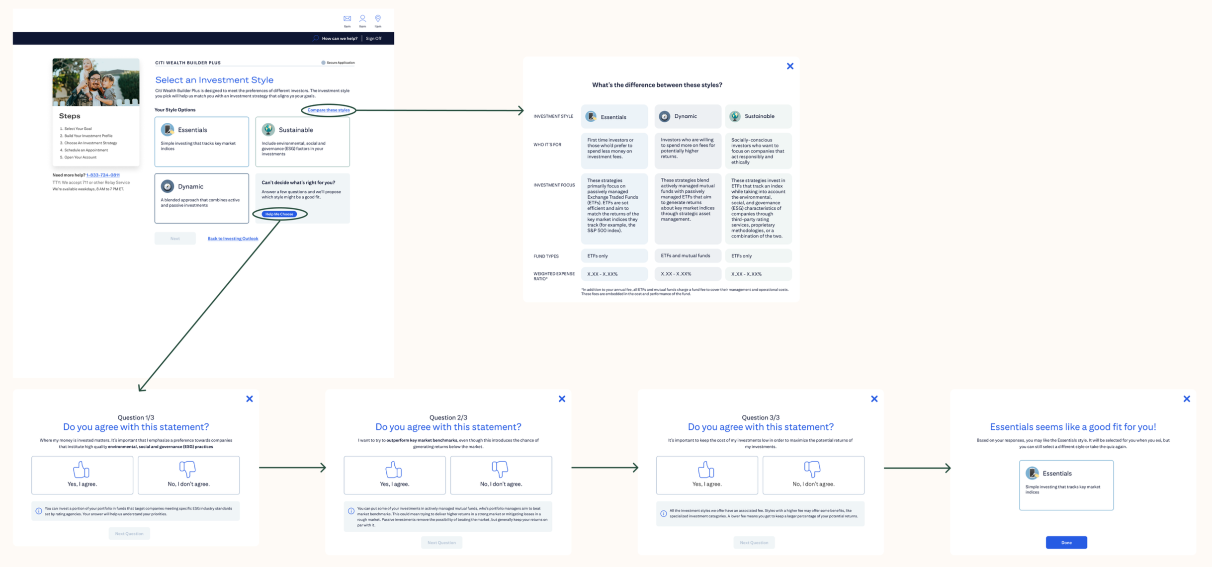 Citi Wealth Builder offers three distinct investment styles, which affect the makeup of their portfolio. Product partners kept making additions to the style selection page, which was becoming cluttered.